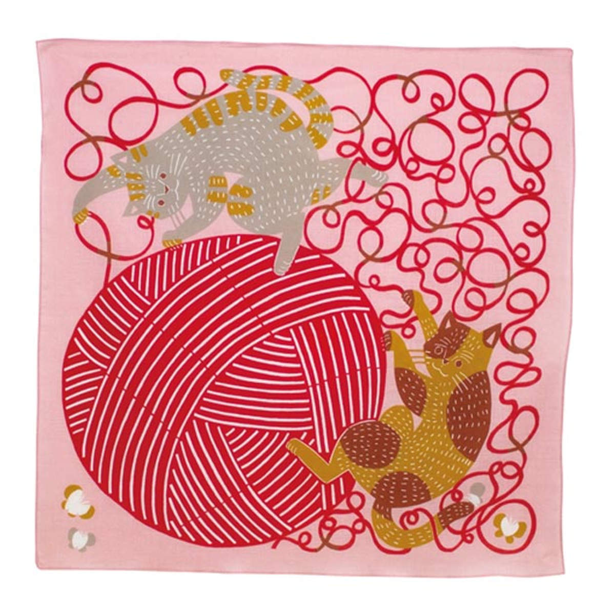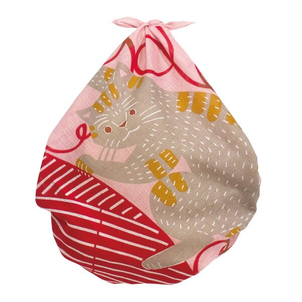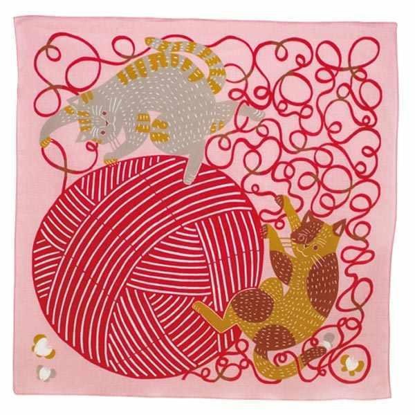 ネコたちが毛糸と遊んでいる姿がお茶目で愛らしい風呂敷です。熱中して毛糸と遊ぶネコと温かみを感じるカラーでデザインされています。