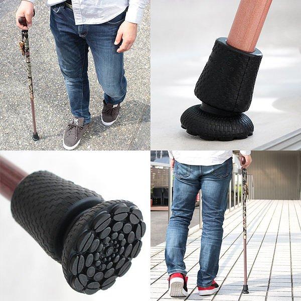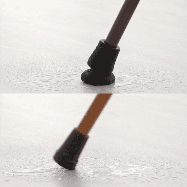 一般的な先ゴム(下の画像)と比較をすると、滑りにくい先ゴム(上の画像)は濡れた地面でもしっかり密着し、滑りにくいので安全に歩行できます。