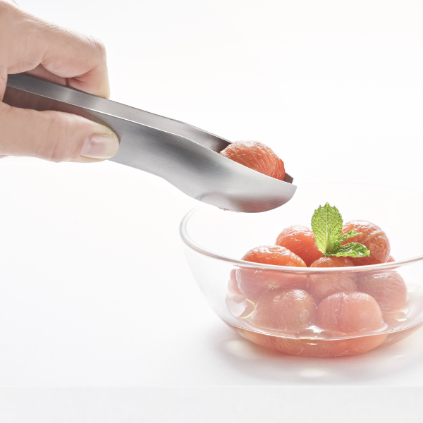 持つ向きでしっかり挟めたり、細かいものを取り分けたりも出来るミニトングです。逆さ向きで使用すると薄いお肉や細かい食材も上手に摘まめます。