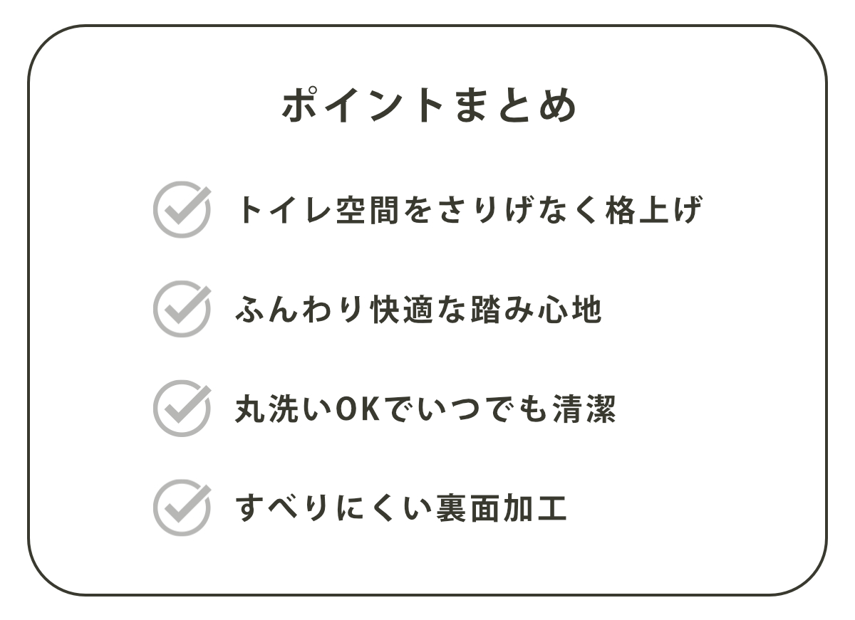 やわらかな質感のポリエステル素材を使用し、足元にふんわりとなじむ快適な踏み心地に仕上げました。サラッとした触感でベタつきにくく、トイレに入った瞬間から心地よさを感じられます。