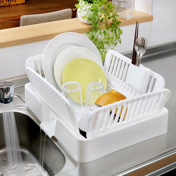トレーには傾斜と凹凸がついており、食器から落ちた水がそのままシンクへと流れていくため、水はけ抜群で水垢やヌメりもつきにくく乾きも早いです。また、かご側面は取り外しができ、隅々まで洗えるのでいつも清潔にお使いいただけます。プラスチック製なので丈夫で軽く、お手入れも簡単で錆びの心配もありません。