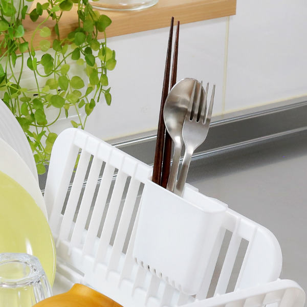 かご側面に掛けることができる、スリムなカトラリーポケット付きです。お箸やスプーンなどのカトラリー類の水切りができて便利です。