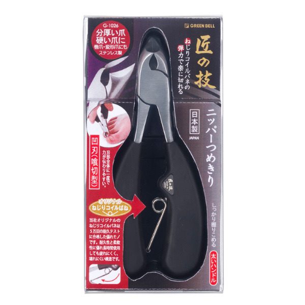 足の爪などの硬い爪や分厚い爪・巻き爪・変形した爪のカットに最適なニッパータイプの喰切型の爪切りです。細かい作業ができ、バネの反発力を利用して軽い力でも一気に切ることができます。