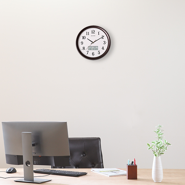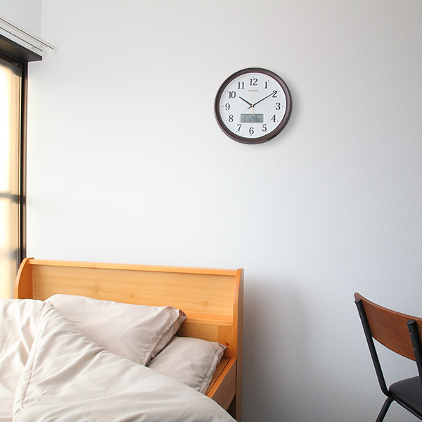 茶色のフレームに、シンプルかつ視認性の高い文字盤の掛け時計です。ご自宅やオフィス、店舗など様々な空間になじみやすいスタンダードなデザインです。