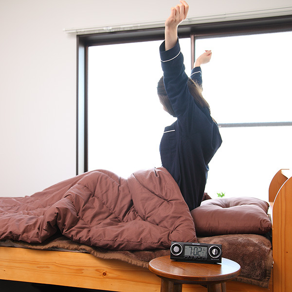 目覚ましの時刻を2つ設定できるので、平日・休日の目覚まし時間の使い分けや、ご家族との時間差起床、二度寝防止の為の時間差設定などにご使用いただくことができます。