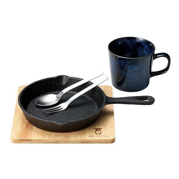 | 材質 | スキレット:鋳鉄 鍋敷き:竹・ポリウレタン塗装 マグ:磁器(美濃焼) スプーン・フォーク:ステンレス鋼 |