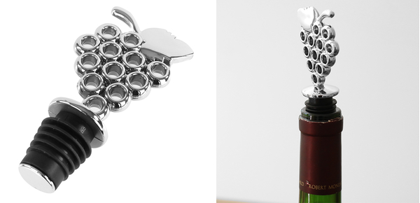 コルクを抜いたワインボトルに簡単に栓ができます。ぶどうをモチーフにしたステンレス調のシンプルなデザインです。