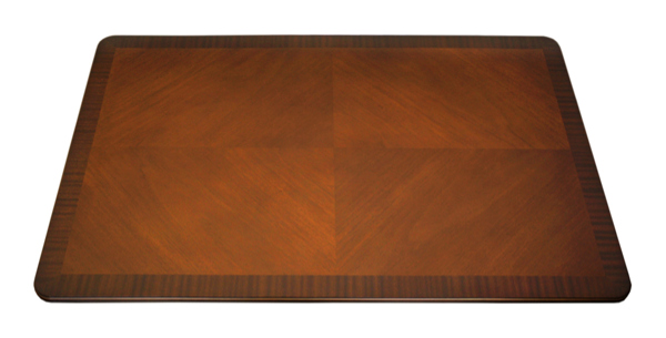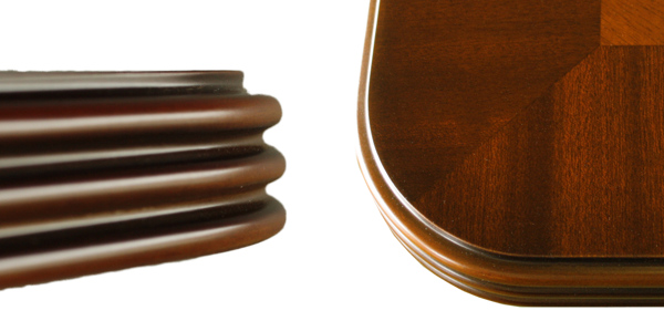 主材はインドネシアで計画的に植林され、伐採したマホガニー材です。天板の縁取りは、異なる杢の表情を活かした帯状の模様貼りを施し、エレガンスさと繊細なイメージを強調しています。アンティーク調の味わいを出すため「スパッタリング塗装」という細かい塗料の粒を散りばめたこだわりの塗装で仕上げています。