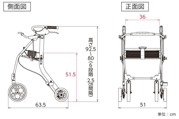 | 材質 | フレーム:アルミニウム タイヤ:EVA樹脂 ハンドルグリップ:エラストマー 座面バッグ:ポリエステル、ナイロン 折りたたみレバー、杖ホルダー上/下:ポリプロピレン |