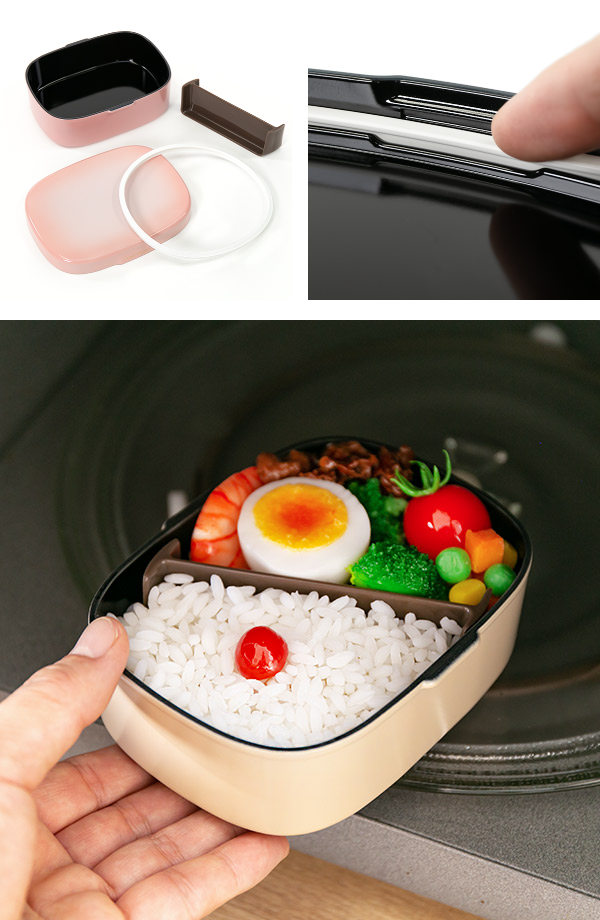 蓋の内側には、パッキンの取り外しがしやすい様にくぼみがあります。中蓋のないシンプルな構造で、食洗機も使用可能なのでお手入れが簡単です。また、電子レンジにも対応しているので、ランチタイムに出来立ての様なほかほか弁当を楽しむことができます。