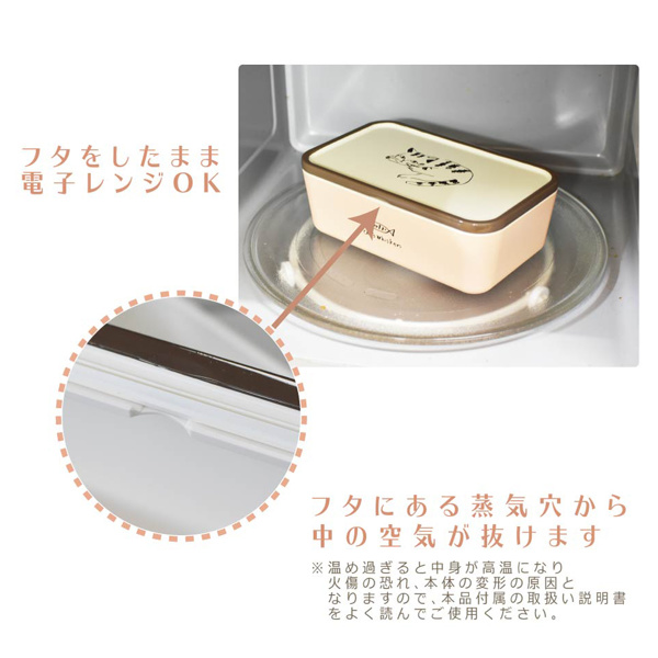 蓋にある蒸気穴から中の空気が抜けるので蓋をしたまま電子レンジで温めることができます。いつも温かいお弁当が食べられます。