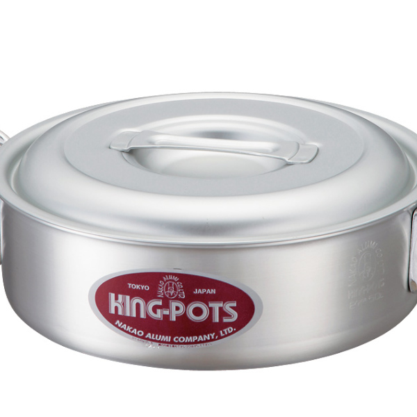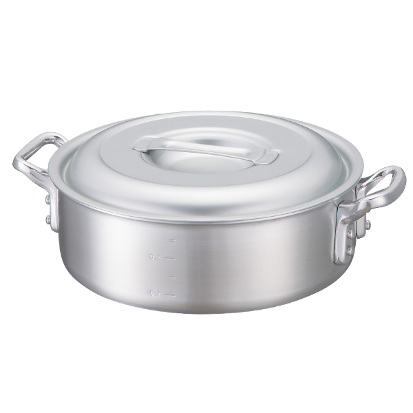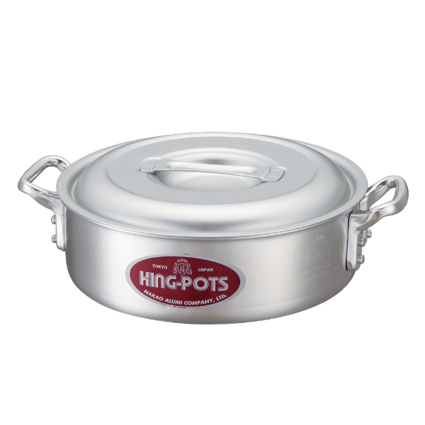 プロユースのハードな使用に適したスタンダードなアルミの外輪鍋です。純度の高いAL1100‐Pアルミ材を使用し、本体は研磨仕上げ、蓋はアルマイト加工が施されています。特殊ドローイングプレス加工により、強靭で耐久性がある頑丈な作りになっています。外輪鍋は食材が重なりにくく熱が均等に行き渡るので煮汁を煮詰めたり、煮魚やブイヤベース作り、すき焼き鍋などお鍋としてもお使いいただけます。素材の厚みなど業務用に設計されたお鍋なので、火力が伝わりやすく調理しやすいです。