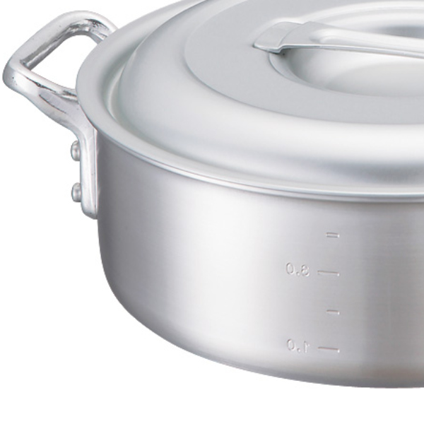 フチ折り曲げ加工、プレス加工効果によりゆがみや変形が少ないです。どの部分を切っても板厚が均一で熱廻りが平均しているのでムラがありません。外輪鍋は鍋底面が広いので水や汁が早く煮立ち、蒸発が早いので煮詰める料理に重宝します。均等に熱が行き渡ることで煮物も崩れにくいです。また、調理時に便利な目盛り付きです。調理容量は8分目程度が目安です。