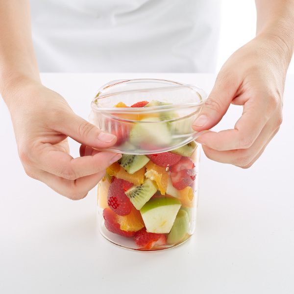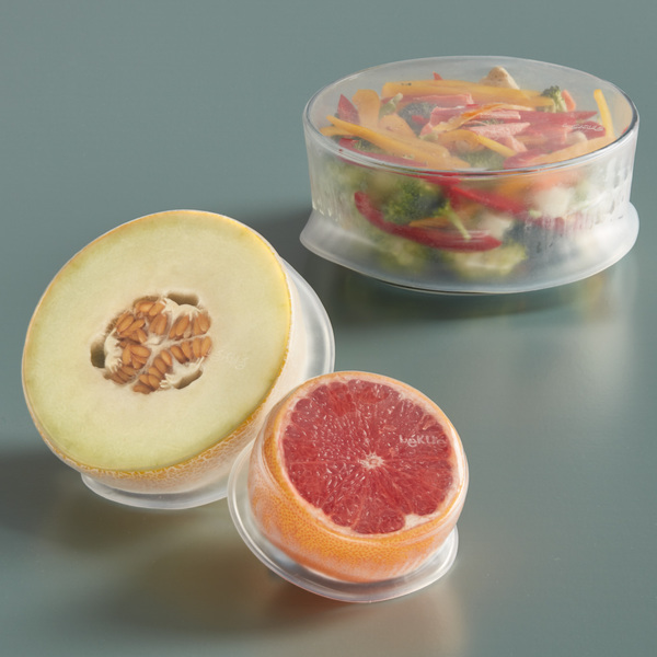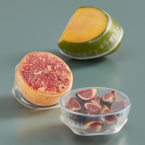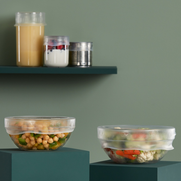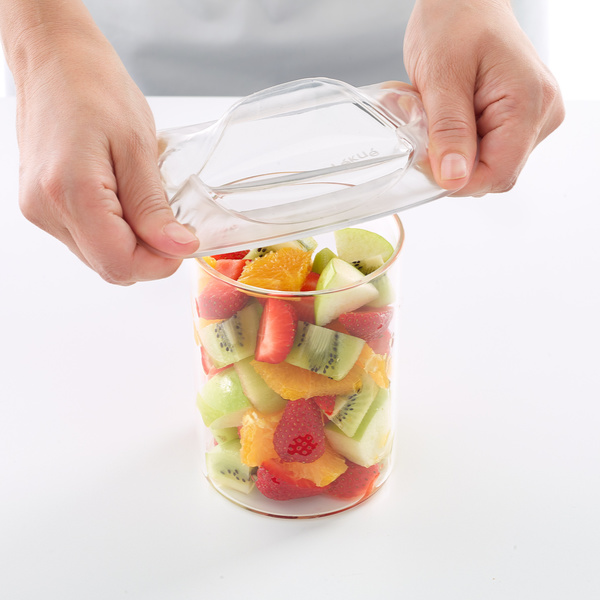 蓋のように何度も付け外しができて、ラップのように簡単にかけられるので様々なものにご利用いただけます。開封後の缶や、ラップのかけづらい形状の瓶や小鉢、野菜やフルーツの断面などにもセット可能です。