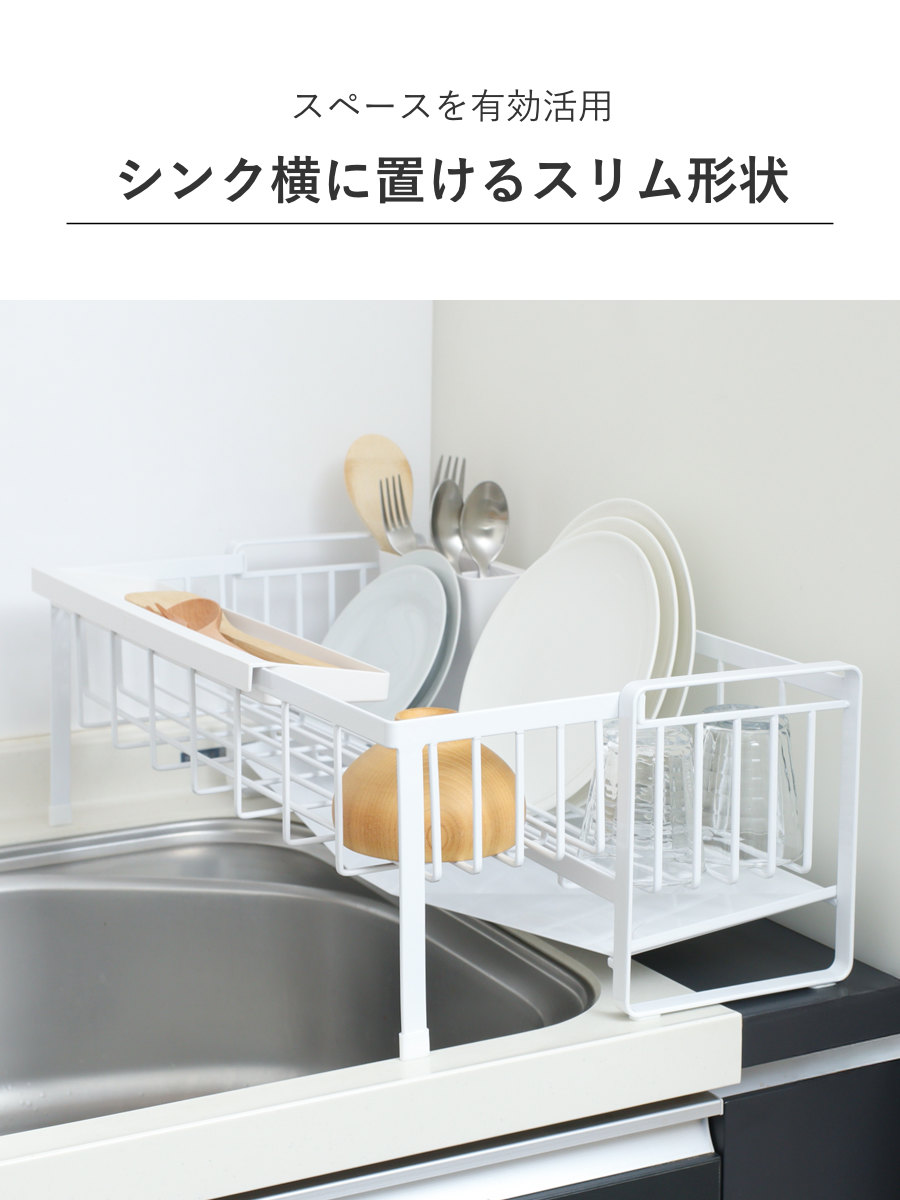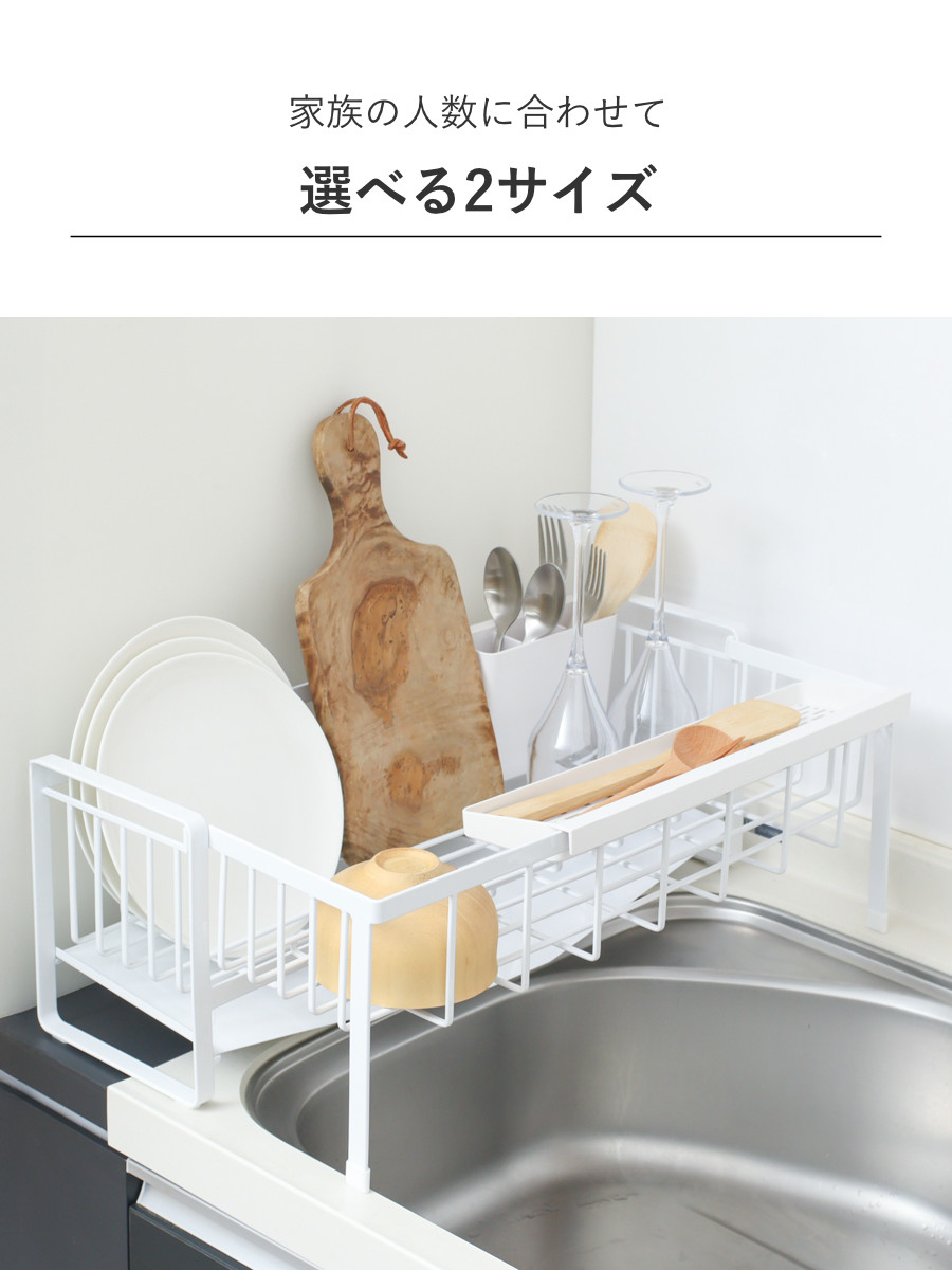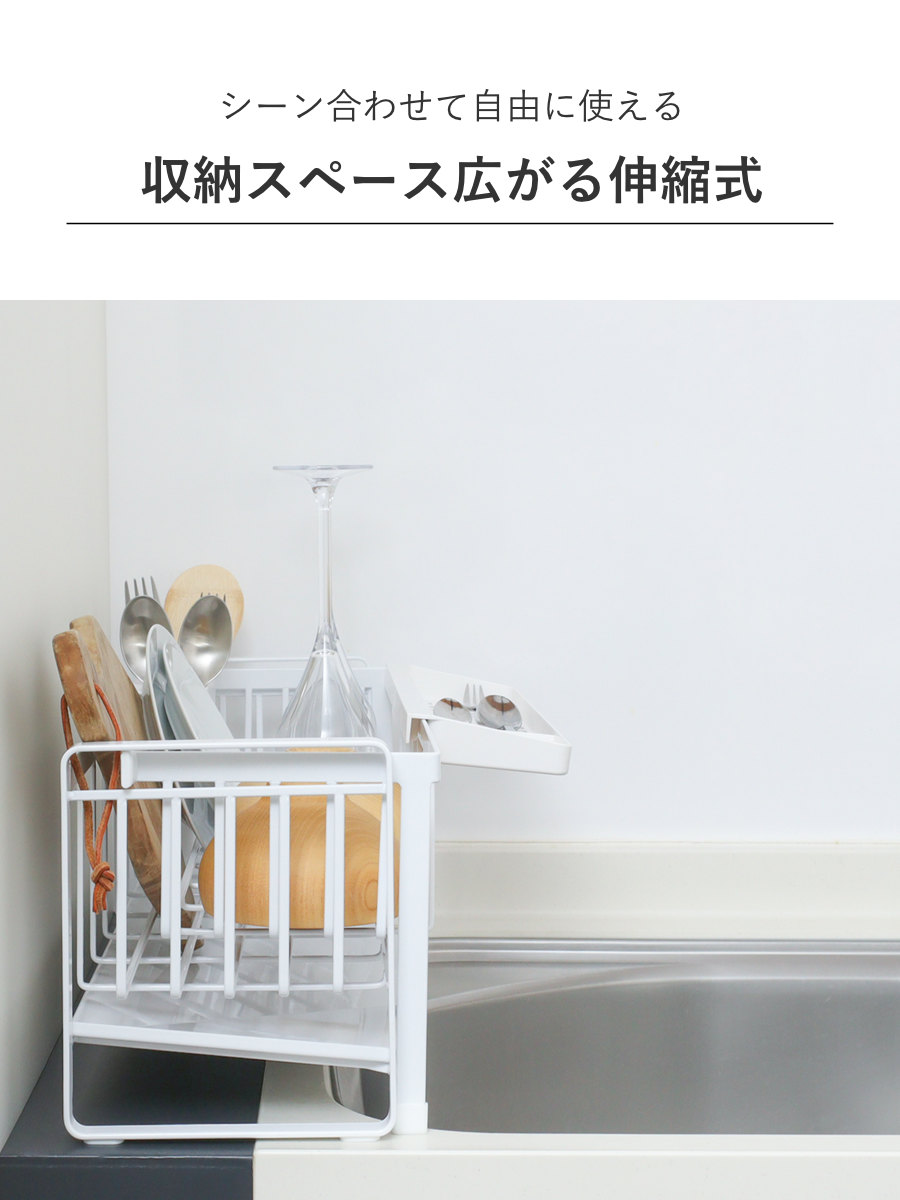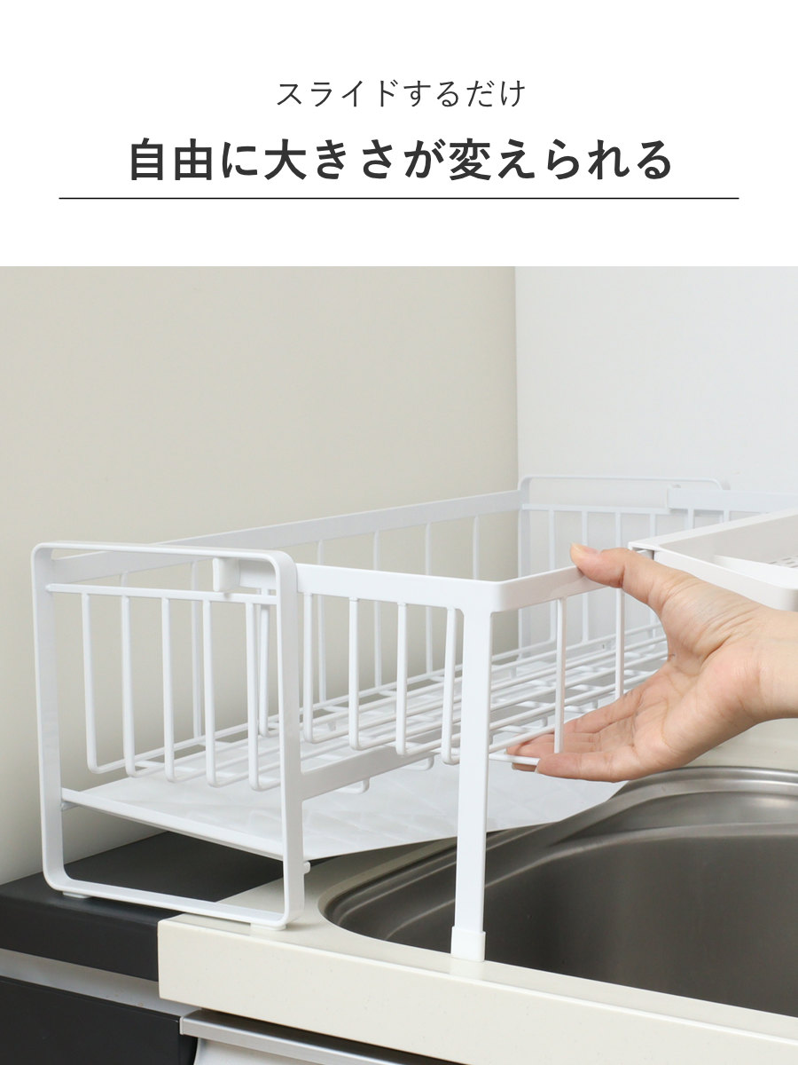 シンクに渡して置ける伸縮できる水切りラックです。シンクサイドのわずかな隙間にも置けるスリムサイズで、調理スペースをしっかり確保できます。食洗機と併用するサブ水切りにもおすすめです。