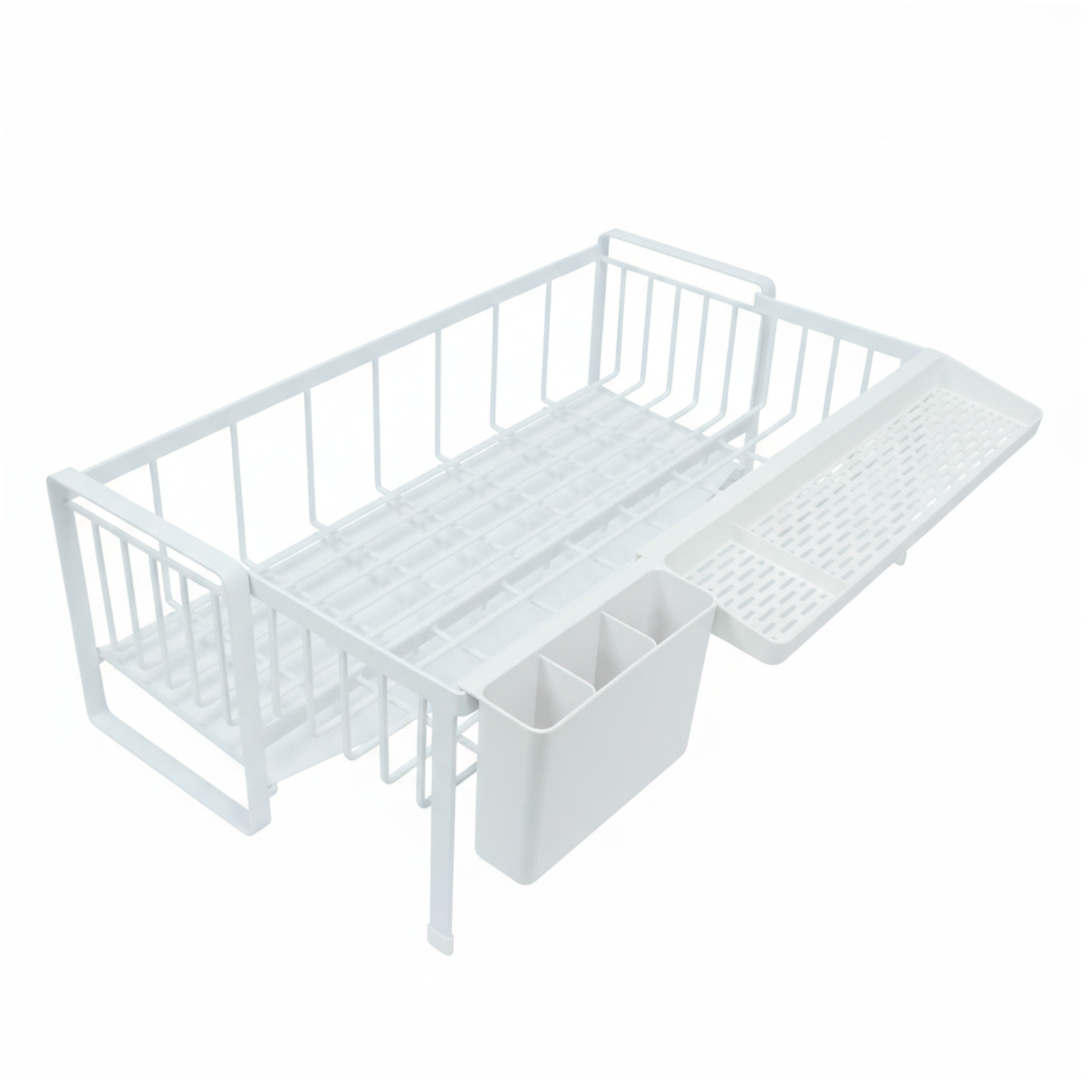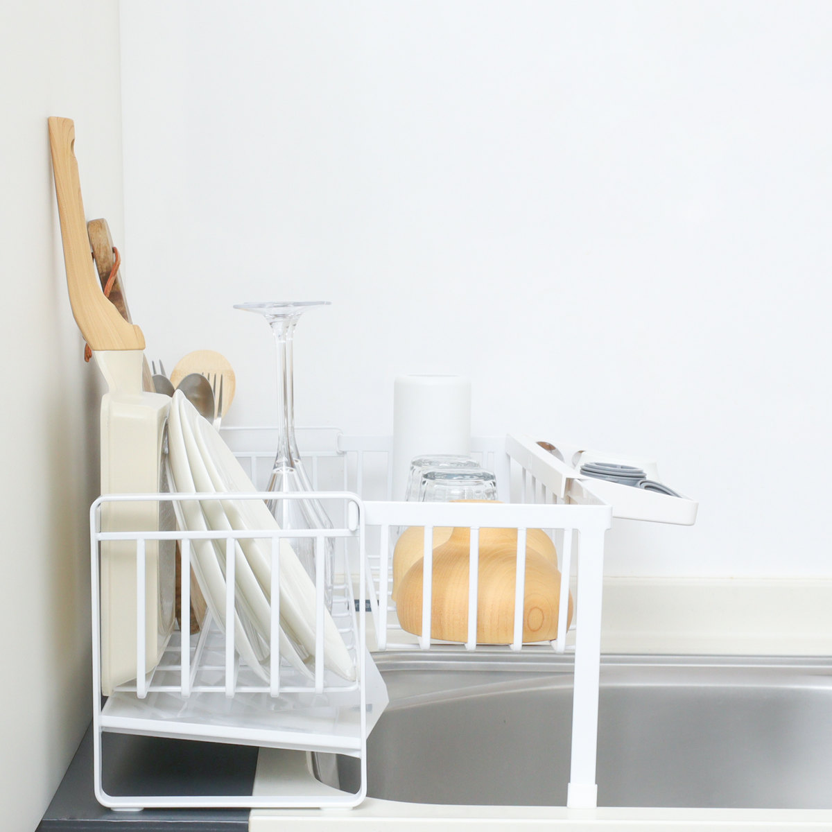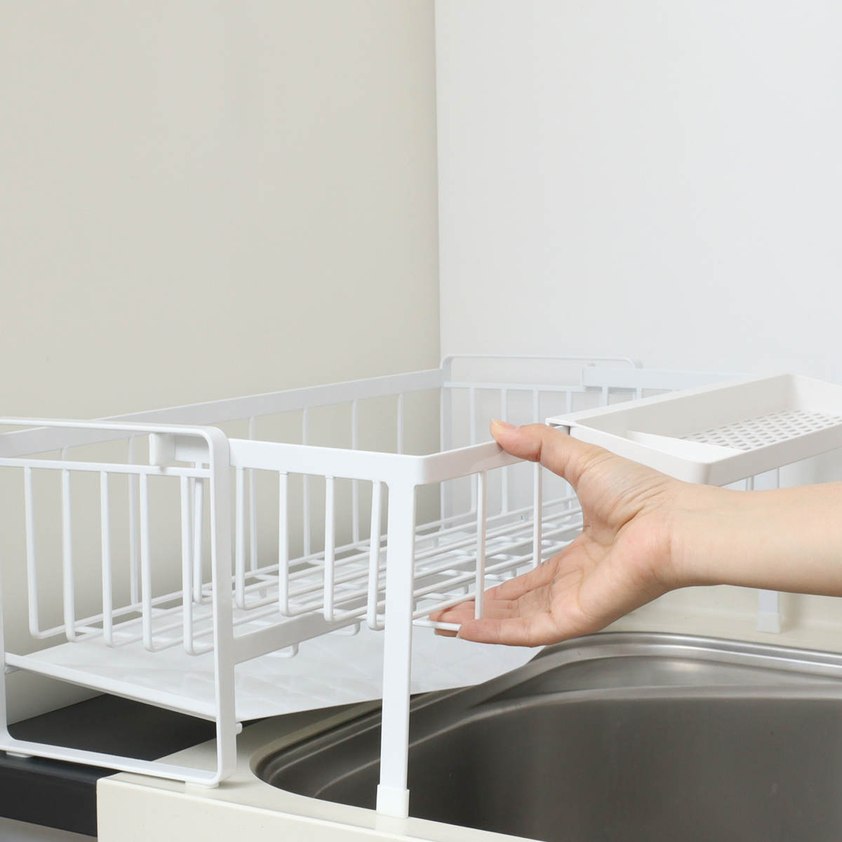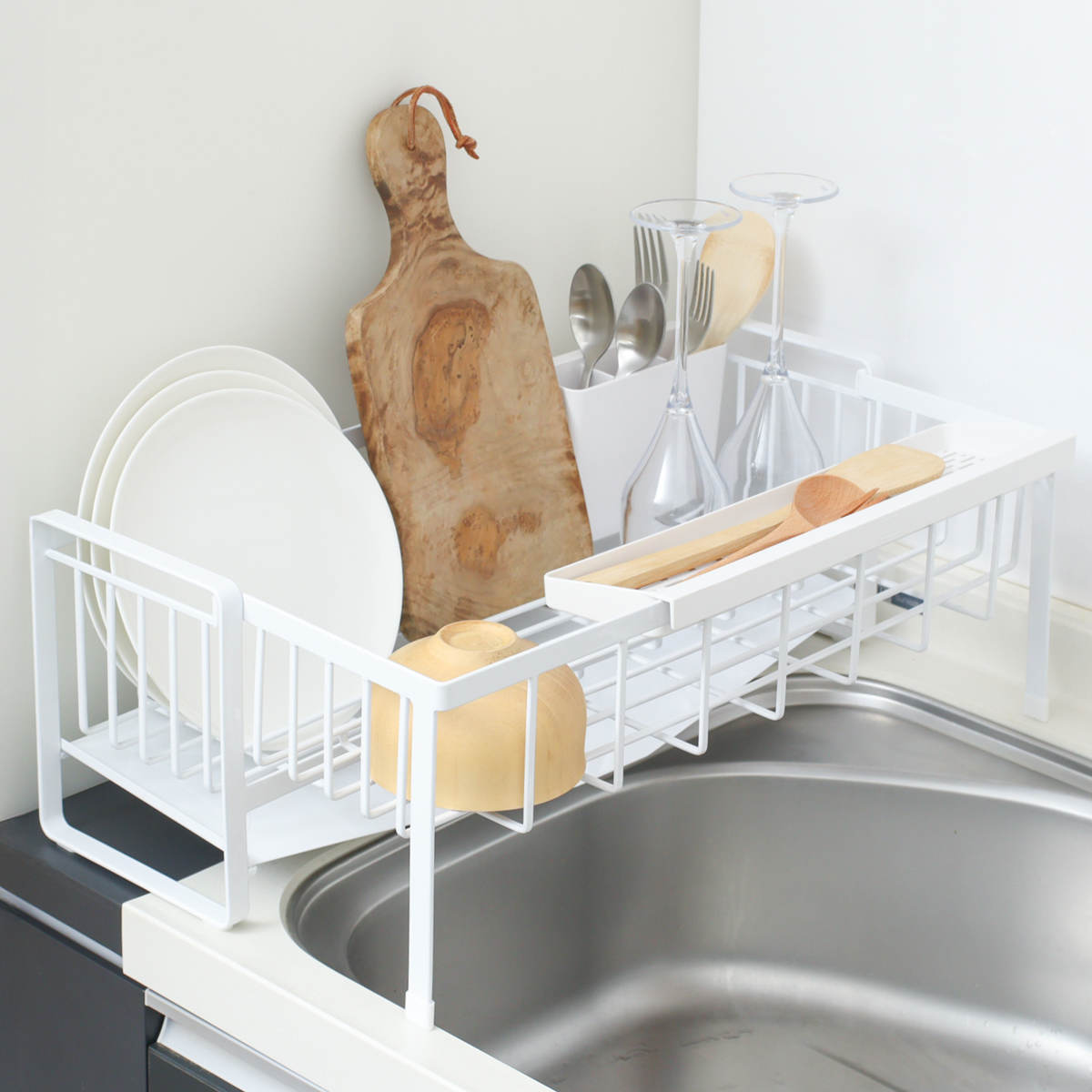 シンクに渡して置ける伸縮できる水切りラックです。シンクサイドのわずかな隙間にも置けるスリムサイズで、調理スペースをしっかり確保できます。食洗機と併用するサブ水切りにもおすすめです。