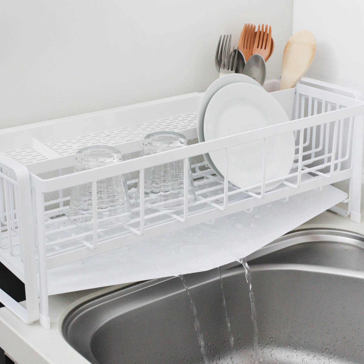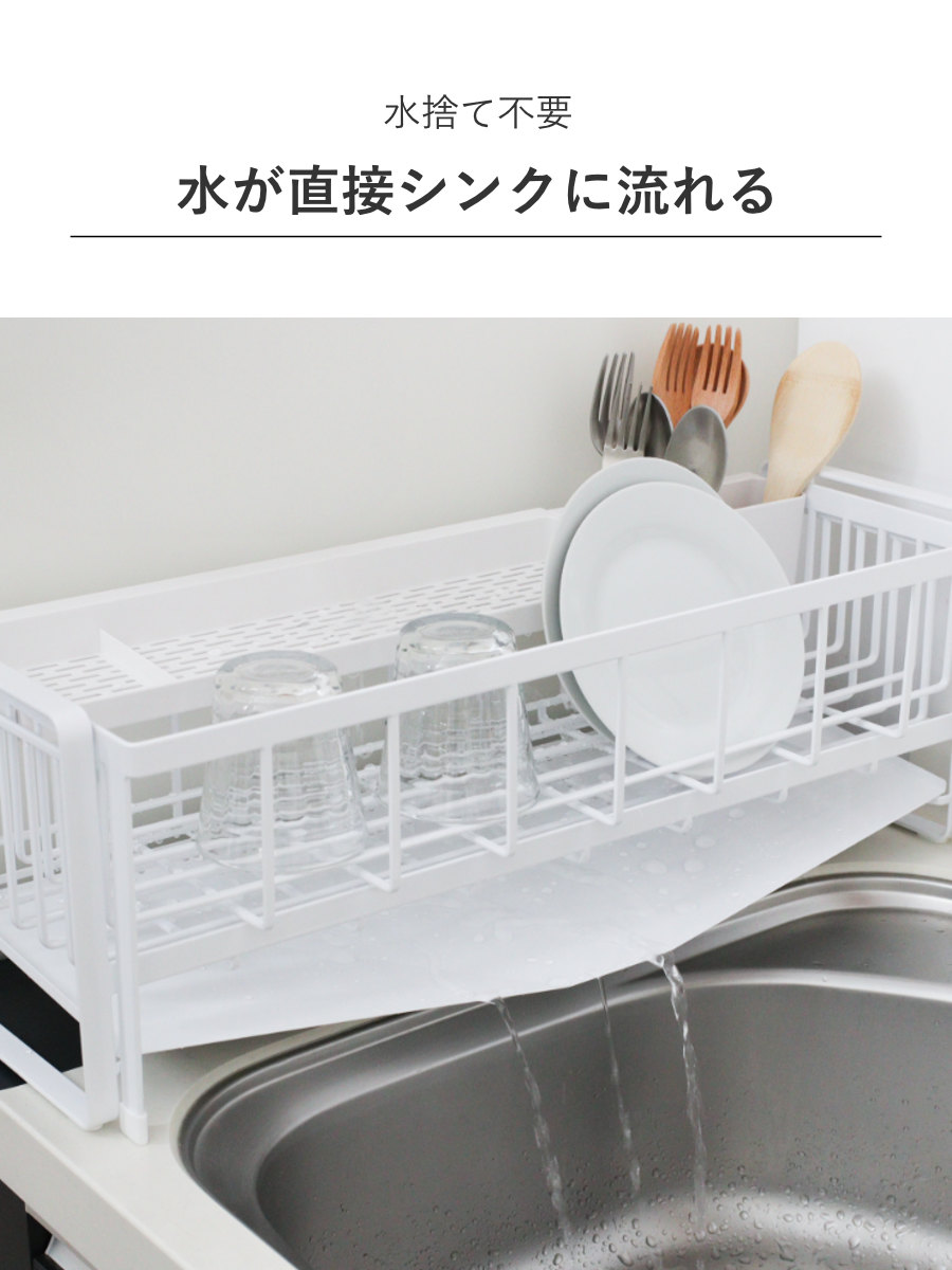 食器から落ちた水は、トレーからシンクに直接排水されるので水捨てが不要です。