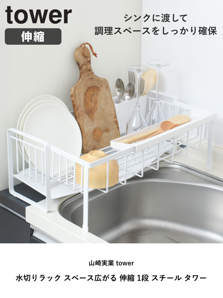 山崎実業 tower 水切りラック スペース広がる 伸縮 1段 スチール タワー ( タワーシリーズ 水切りカゴ 水切り 大容量 コンパクト 水切りかご 水切りバスケット 折りたたみ シンク上 スリム シンク横 ) 【ホワイト】