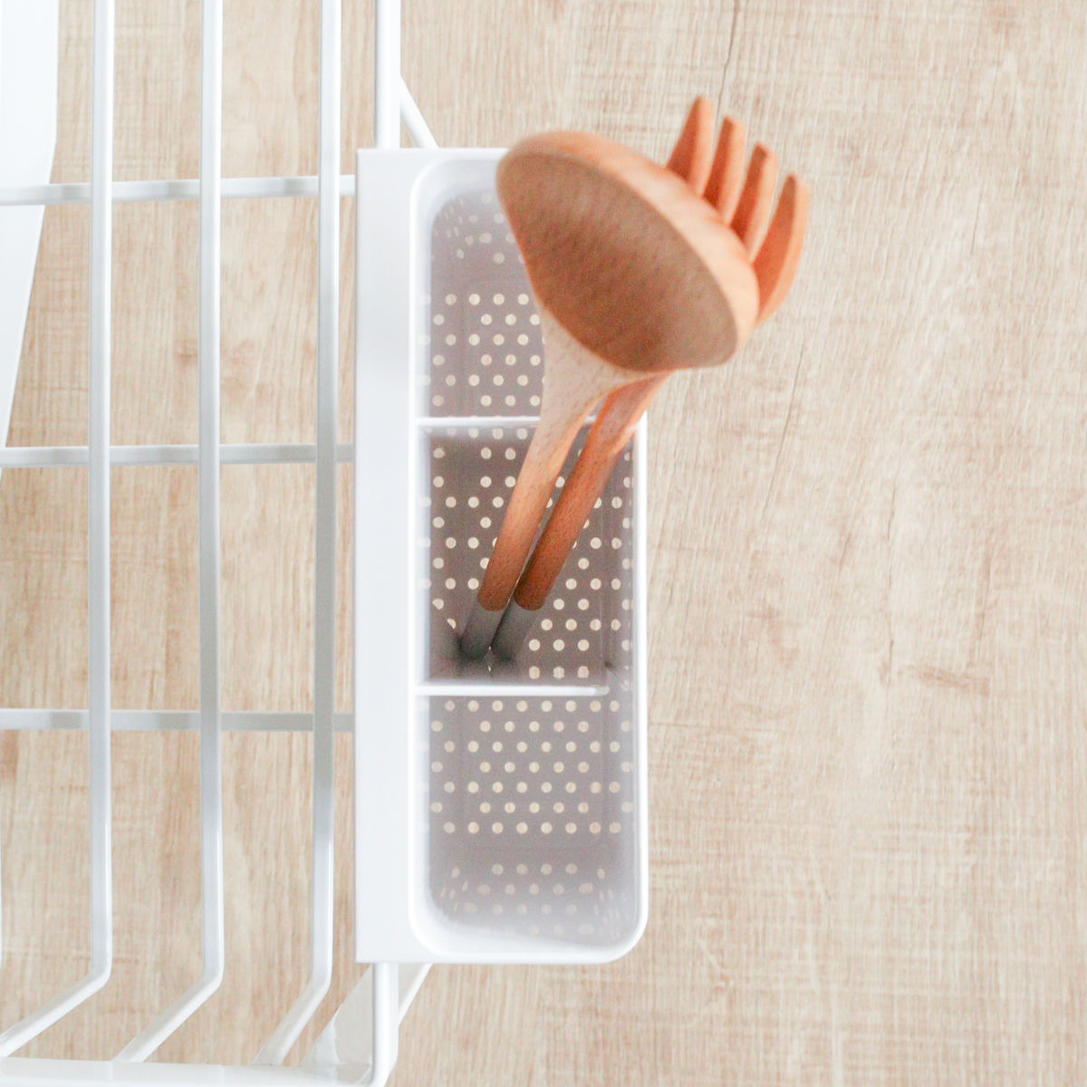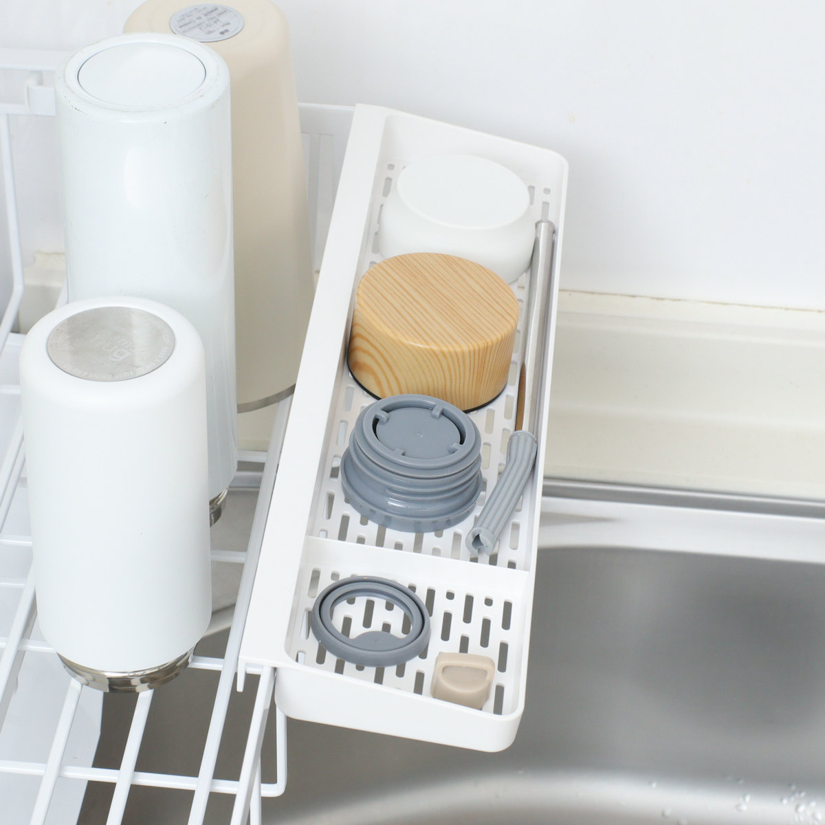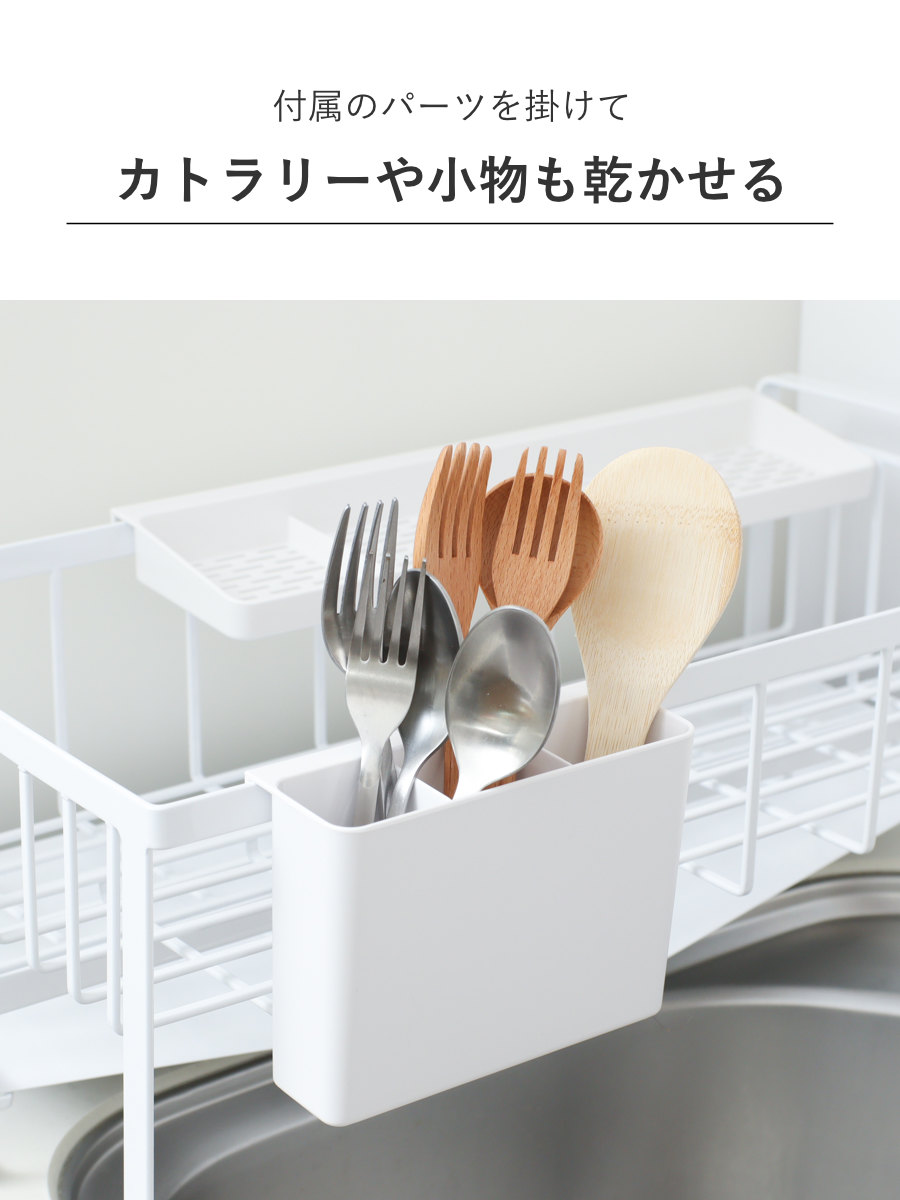 カトラリーポケットとカトラリートレーが付属します。どちらも仕切り付きでカトラリーやお弁当小物、寝かせた包丁など整理整頓しながら乾かせます。スペースや食器の量に合わせてラックの内側と外側、自由に配置できます。また、別売りのフックを付けると輪ゴムや水筒パッキン、スポンジなどの小物を掛けて収納できます。