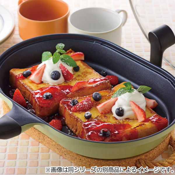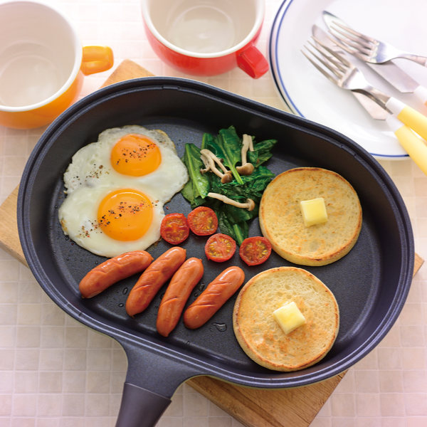 面積の広い横長型なのでワンプレートにも使えます。フレンチトーストを一度に2枚焼いたり、朝食のおかずも一度に焼けるので忙しい平日の朝食や夕食、常備菜作りにも大活躍します。熱伝導のよいアルミニウム合金を使用しているので、フライパンの端の方にも火が通りやすくなっています。