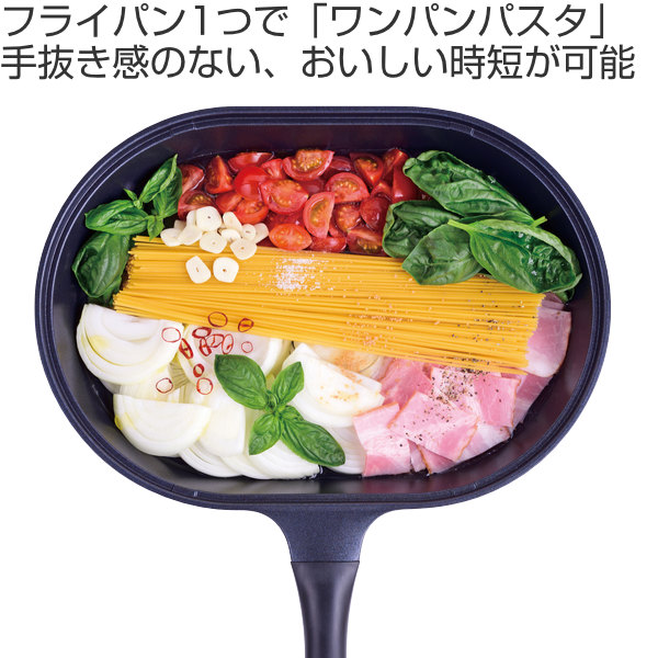 ロングパスタを折らずに丸ごと茹でられるフライパンです。パスタと材料を入れて火にかけるだけでワンパンパスタ(フライパン1つで作る調理法)が出来上がります。トマトとバジルのパスタ2人分は約17分で作ることができ、パスタを鍋で茹でた場合と比較してトータル時間を約11分短縮できます(メーカー比)。ワイドサイズなので色々な料理が作れます。ワンパンパスタのレシピ付きです。