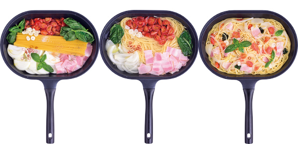 パスタと材料を入れて火にかけ、水分が飛んだら出来上がりです。時短、節水、洗い物が減り、お手軽にパスタが作れます。野菜など具材もたっぷり入るのでメニューのマンネリ化の心配もありません。