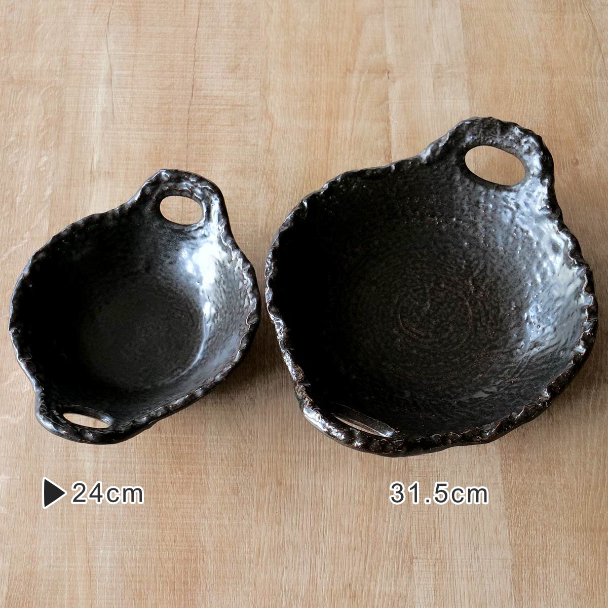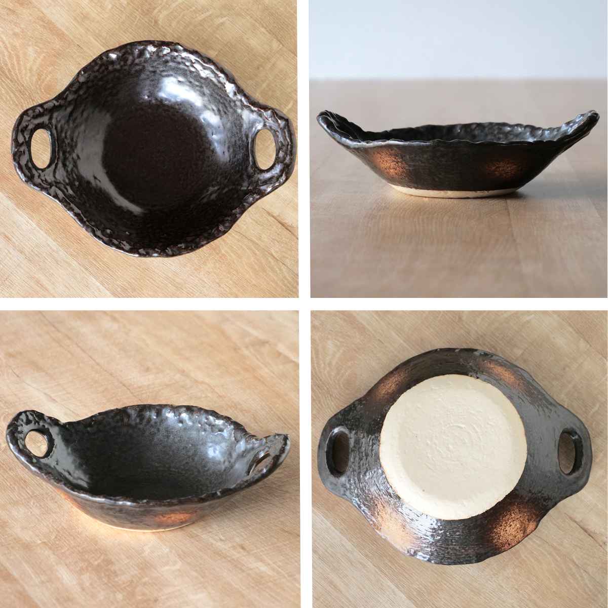 全体に釉薬が塗られつるりとした質感ですが、凸凹があり素朴な風合いです。縁が立ち上がっているので煮込み料理も盛り付けやすく、両サイドに持ち手があるので食卓に運ぶ際にも持ちやすいです。