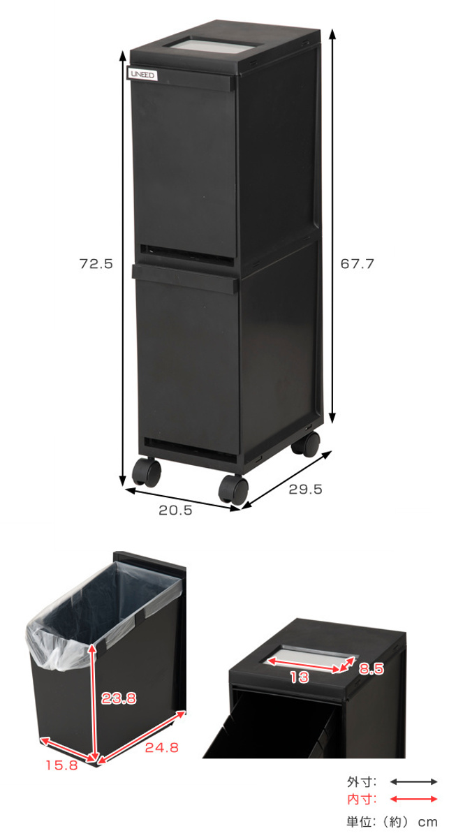 | サイズ | 約 幅20.5×奥行29.5×高さ72.5(cm) キャスターなしの場合:約 幅20.5×奥行28.5×高さ67.7(cm) |