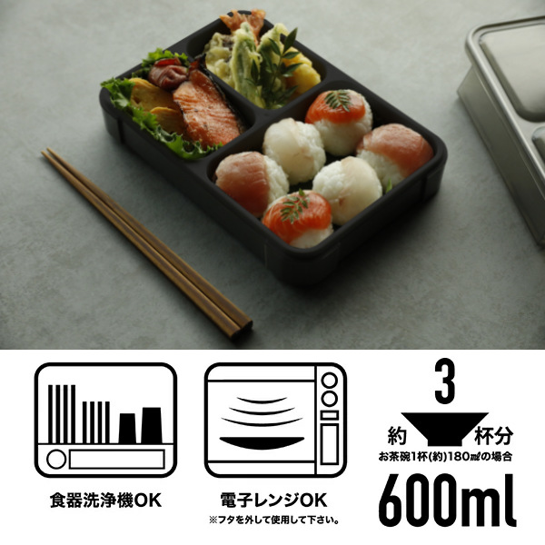 厚さがわずか3.5cmなのに、ご飯がお茶碗約3杯分も入ります。男性にも女性にもちょうどいいサイズです。(※お茶碗1杯約180mlの場合)一体成形のパッキンで蓋との間に汚れが入りにくく、パッキンを外して洗う必要がないのでお手入れ簡単です。本体は角が丸くて洗いやすいので、汚れが落としやすいです。また、食洗機や電子レンジにも対応します。