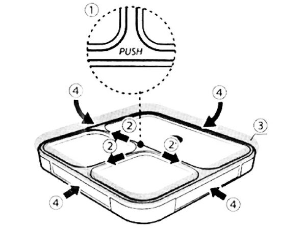 ●その後、蓋の中心(PUSH)から外側へ向かって蓋を本体に密着させていき(上図2の矢印方向)、弁当のフチと角を押して蓋と本体を密着させます(上図3の灰色のライン)。