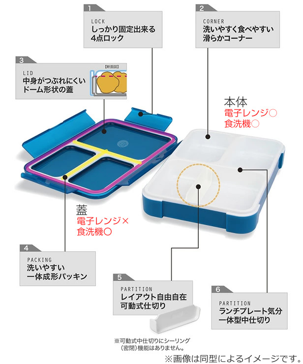 ●蓋と一体型のパッキンや仕切りでお弁当内での味移りを防いでくれます。