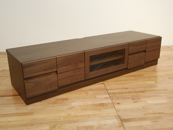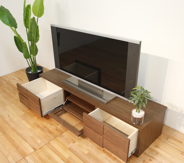前板にライン加工を施した、お洒落なテレビボードです。モダンなデザインが、どんなお部屋にもマッチします。表面材にはウォールナット無垢材を使用しており、天然木ならではの木目の温かみが感じられ、風合いを楽しむことが出来ます。