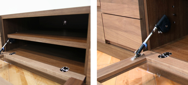 | 3段引きスライドレール フルオープンレールを使用しており、引出し全体が手前に引き出せるので、奥の物もスムーズに取り出せます。 | 引出し収納 テレビ周りの小物類を整理できます。隠す収納で生活感を見せないスッキリした印象になります。 |