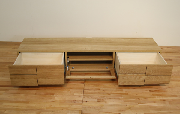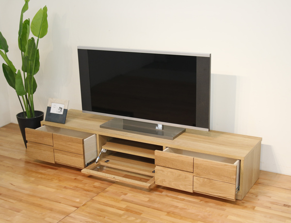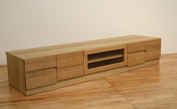 前板にライン加工を施した、お洒落なテレビボードです。モダンなデザインが、どんなお部屋にもマッチします。表面材にはホワイトオーク無垢材を使用しており、天然木ならではの木目の温かみが感じられ、風合いを楽しむことが出来ます。