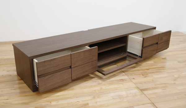 前板にライン加工を施した、お洒落なテレビボードです。モダンなデザインが、どんなお部屋にもマッチします。表面材にはウォールナット無垢材を使用しており、天然木ならではの木目の温かみが感じられ、風合いを楽しむことが出来ます。