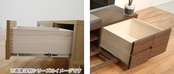 | 3段引きスライドレール フルオープンレールを使用しており、引出し全体が手前に引き出せるので、奥の物もスムーズに取り出せます。 | 引出し収納 テレビ周りの小物類を整理できます。隠す収納で生活感を見せないスッキリした印象になります。 |
