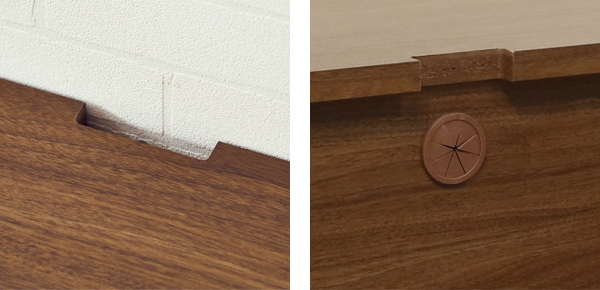 | コードスリット コードスリットがあり、壁にぴったり付けてもテレビの配線を裏に通すことができます。 | 配線穴 DVDレコーダーやゲーム機などのAV機器の配線を後ろに通していただけるようになっているので、配線がごちゃつかず片付いた印象になります。 |