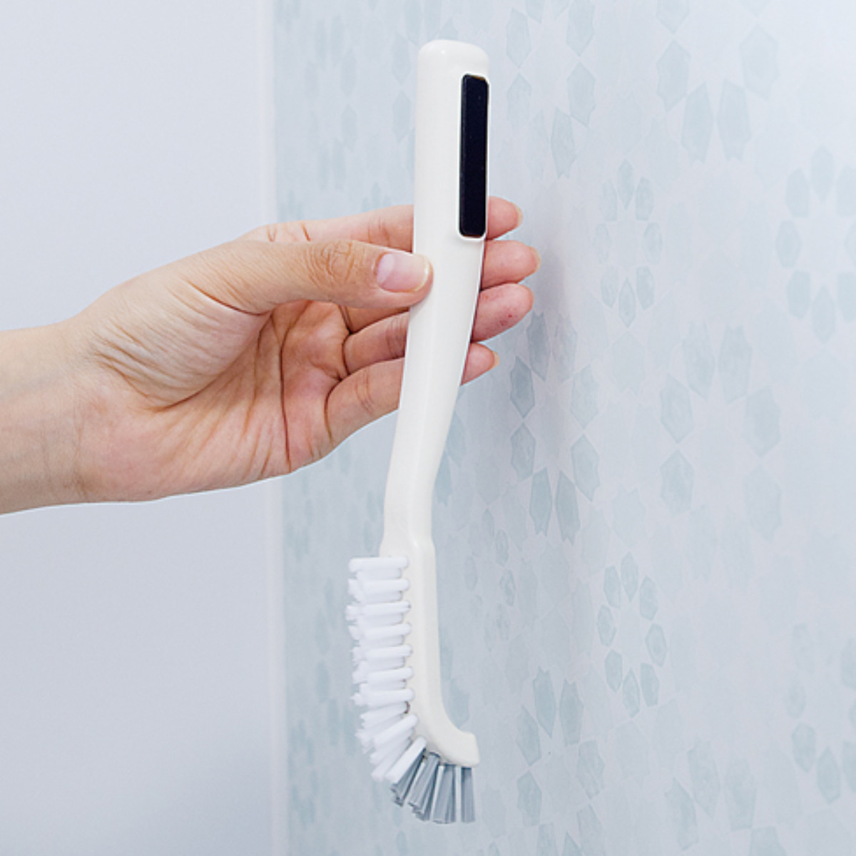 洗いにくかった浴室の溝など細々したところが洗えるブラシです。グレーの硬めブラシで角に詰まった汚れやこびりついた汚れをかき出し、白いやわらかめのブラシで汚れをこすり落とします。細くて持ちやすい形をしているので、女性の手でもしっかりと握ることができます。