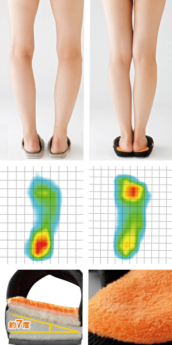 約7度の傾斜が重心を内側に寄せてO脚補整にも効果的です。足に優しいパイル生地で履き心地抜群です。