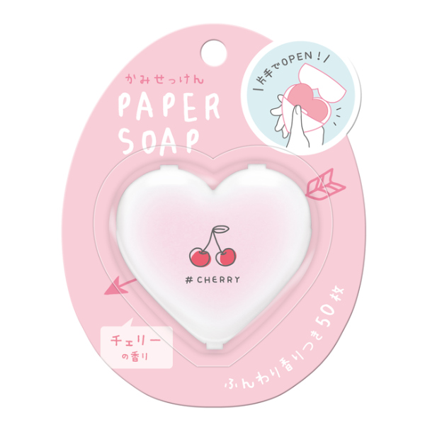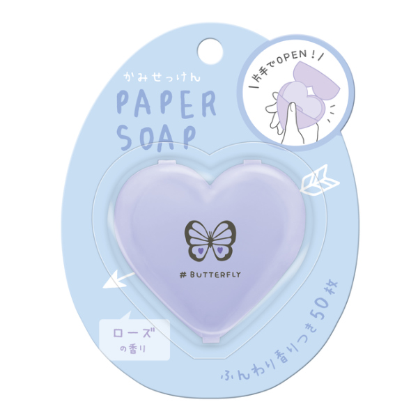 ハート型のお洒落な紙せっけんです。持ち運びに便利なポケットサイズで、ボディウォッシュに使えるので旅行などにも便利です。
