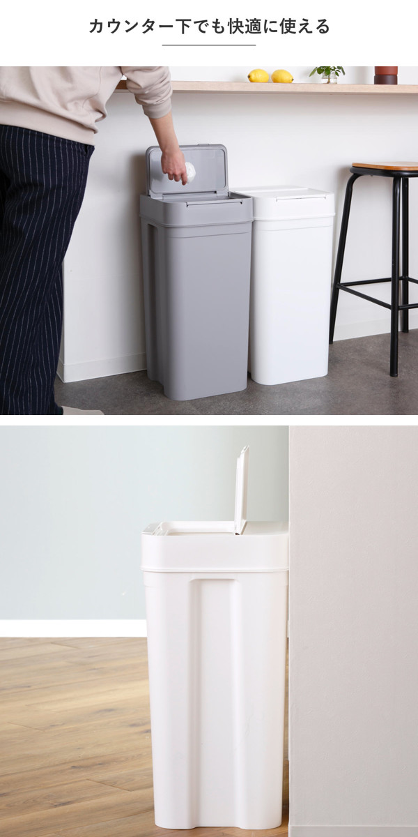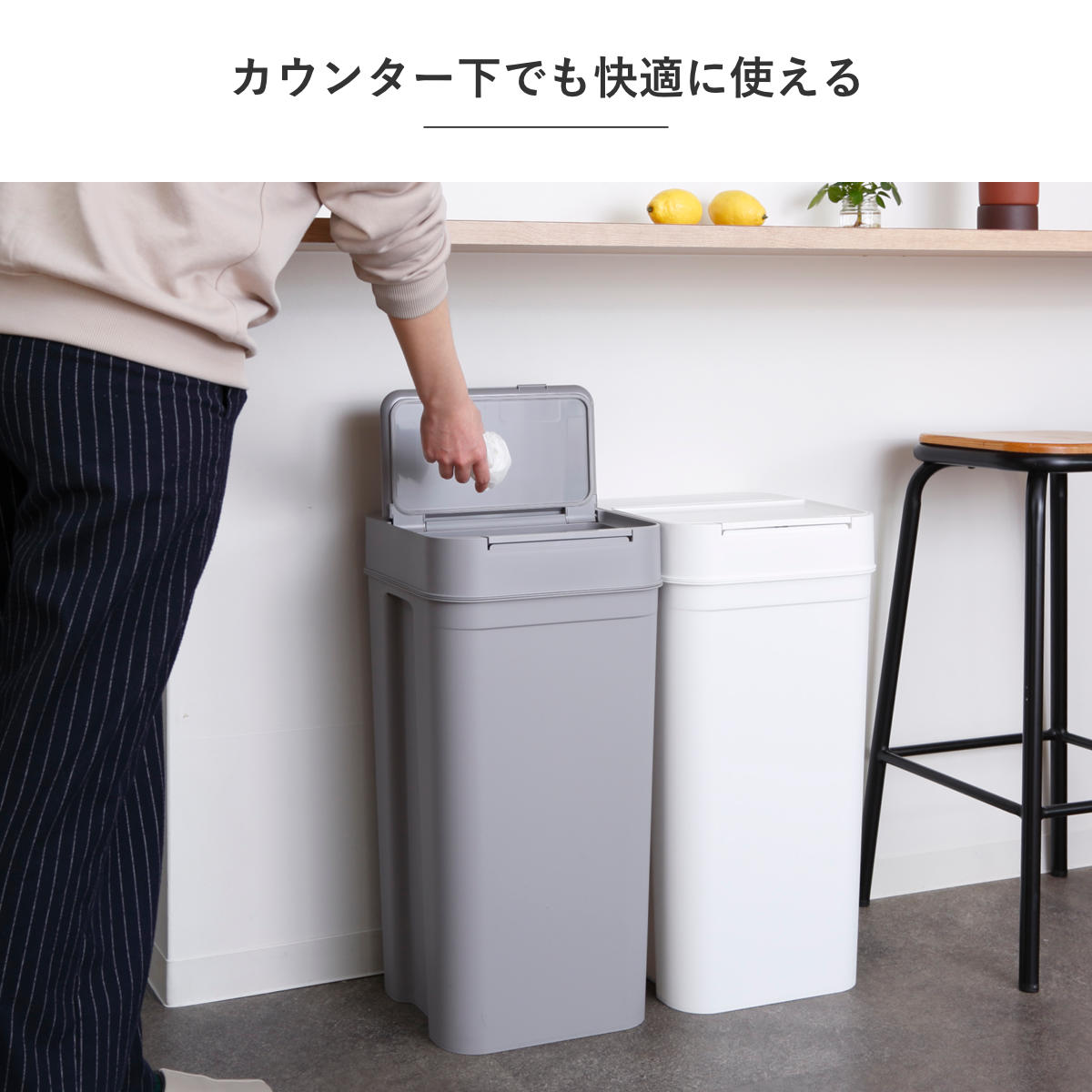 フルオープンしない構造のふたで高さを抑え、カウンター下にもすっきり収まります。上のスペースを気にせず使えるのも嬉しいポイント。立ったままでもサッと捨てやすく、毎日のゴミ捨ても心地よく行えます。