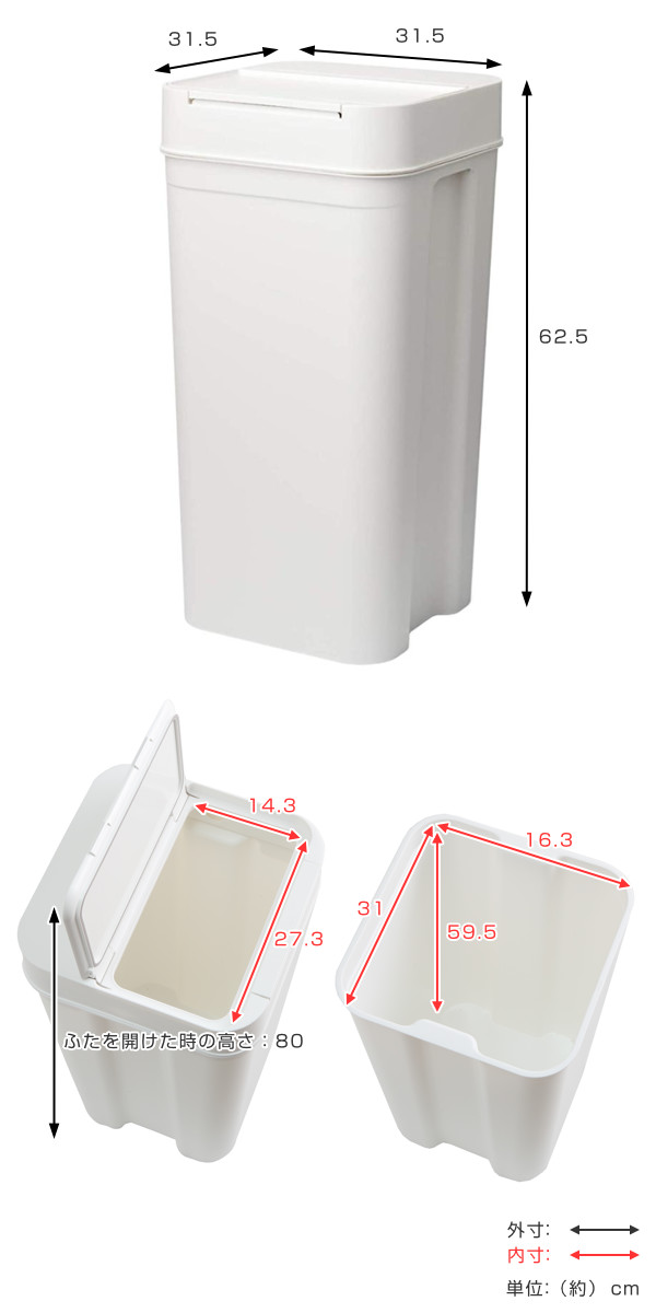 | 材質 | 本体・ふた枠・袋止め:ポリプロピレン ふた・スイッチ・バネカバー:ABS樹脂 |