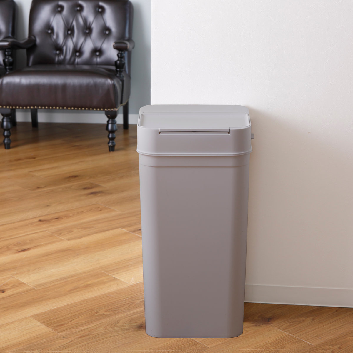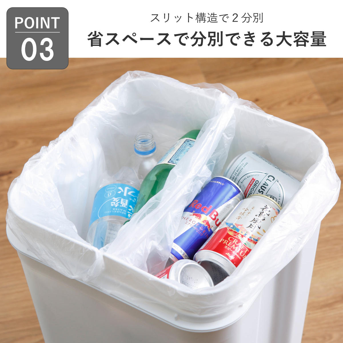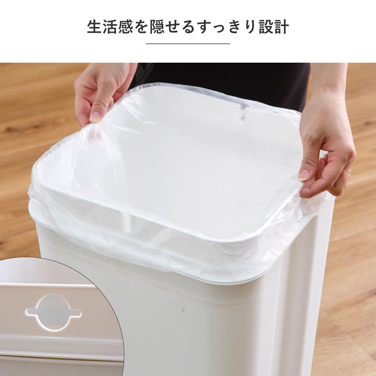 袋止めのスリットでゴミ袋を2つまでセットでき、これひとつで分別も可能。場所を取らず、すっきり使えます。45Lのたっぷり容量でも、すっきりとした見た目で置きやすいのが魅力です。