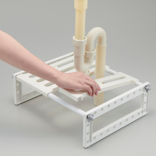 洗面下の収納時、ラック設置時に困るのが排水トラップです。こちらのラックは、排水パイプ部分を避けて設置することができます。スペースを有効活用することにより、より多くの小物を収納できるので洗面所まわりがすっきりとします。