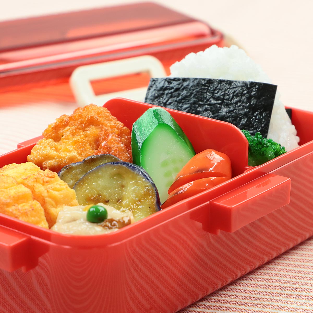 お弁当箱は深さのあるので、サンドイッチやパスタなどのメニューにもおすすめです。見た目以上に沢山入るので、しっかり食べたい時はご飯を詰めた上に大きなおかずをのせるのっけ弁、低学年のお子様はご飯を少なめに入れて、全部食べれるようにお弁当の量を調節できます。