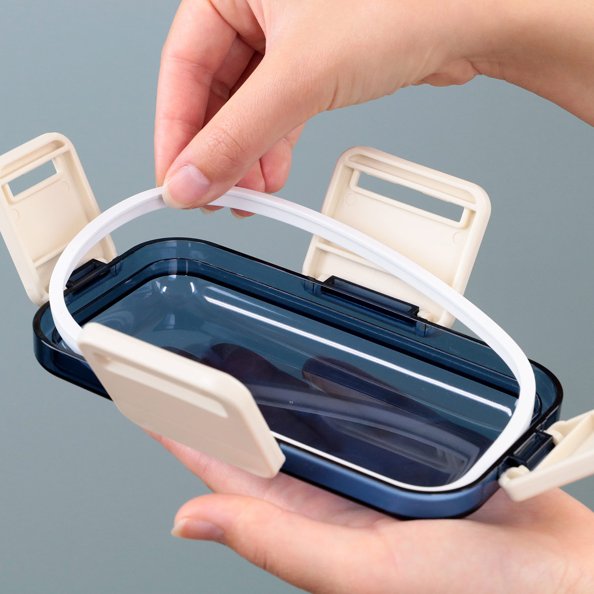 蓋裏のパッキンと4点ロックでしっかり固定できるので、汁漏れしにくく、持ち運ぶ時も安心です。閉める時はカチッと音がするので閉め忘れがありません。