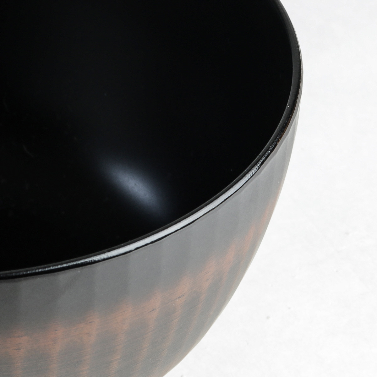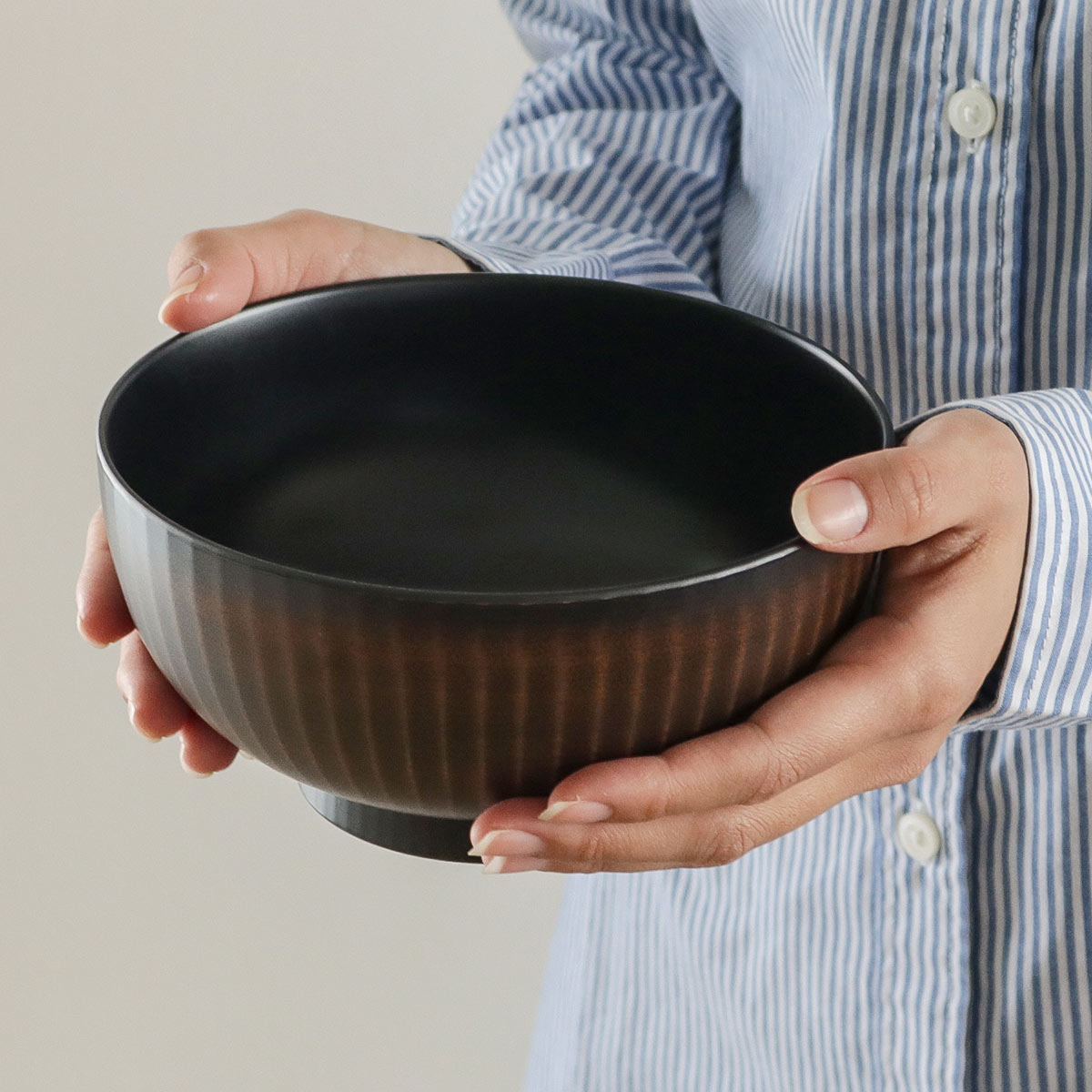 表面はさらさらとした手触りでマットな質感です。軽くて持ちやすく、表面が熱くなりにくいので持ち運びにも便利です。縦のラインがアクセントとなり、盛り付けたご飯をひと際引き立ててくれます。