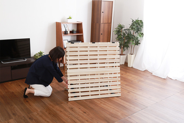 使わない時は折りたたんでコンパクトに収納できます。桐製のベッドなので軽く、女性でも簡単に持ち上げることができるため移動もラクラクです。