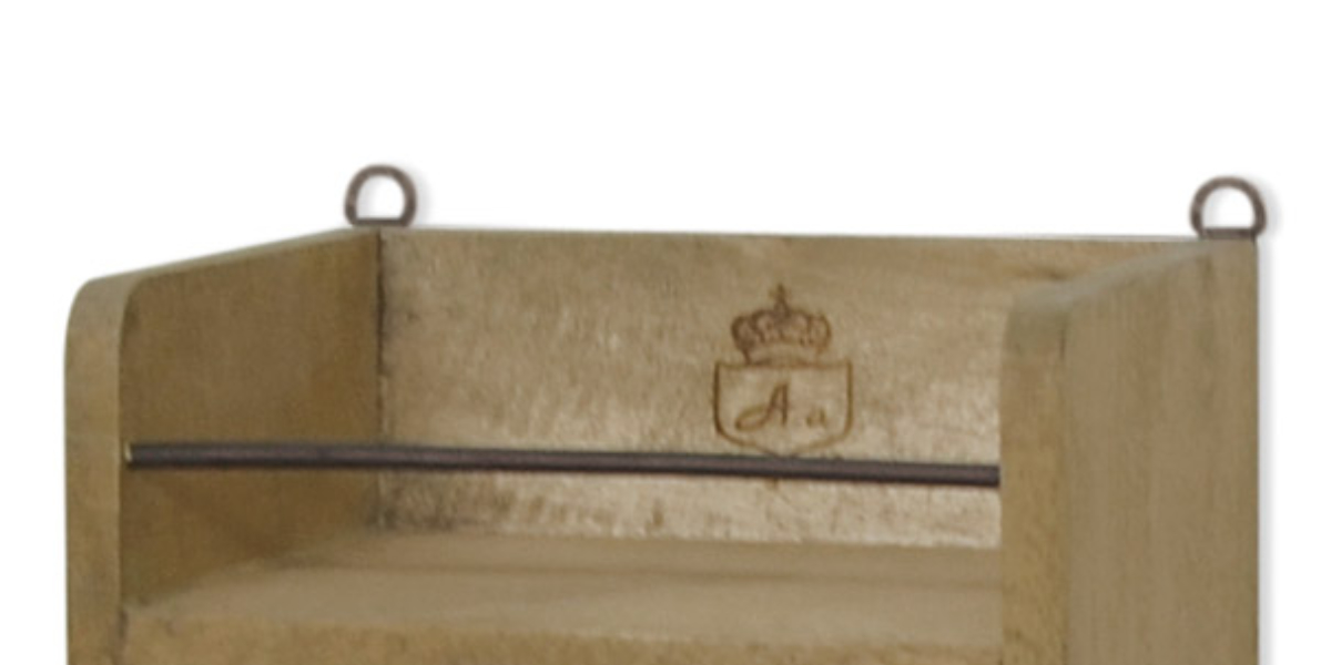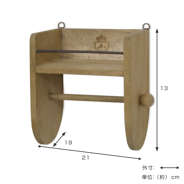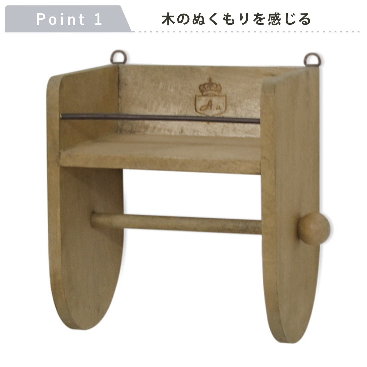 アンティーク感のある木製のトイレットペーパーホルダーです。丸みを帯びたやさしいフォルムで、手づくりの温かさを感じることができます。正面に焼印されたazi-aziオリジナルのクラウンロゴがアクセントになり、オシャレです。