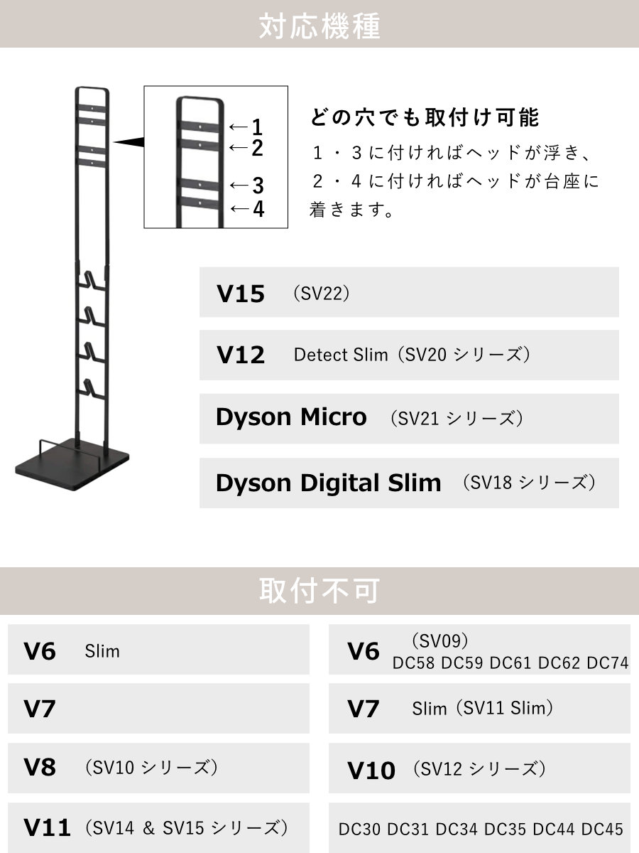 | 備考 | 付属品:六角レンチ×1、スパナ×1 ※対応サイズ:ダイソンマイクロ(SV21シリーズ)収納用ブラケットが付属している商品。 ダイソンデジタルスリム(SV18シリーズ)収納用ブラケットが付属している商品。 上記以外の機種は対応しておりませんので、ご注意ください。 |